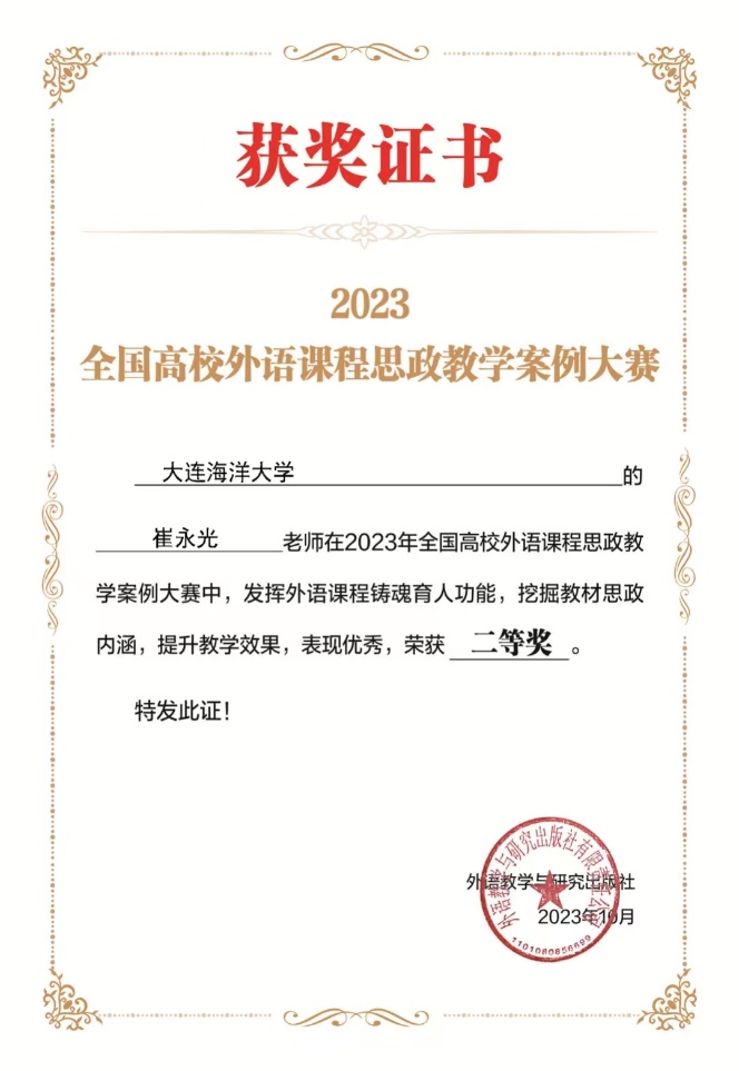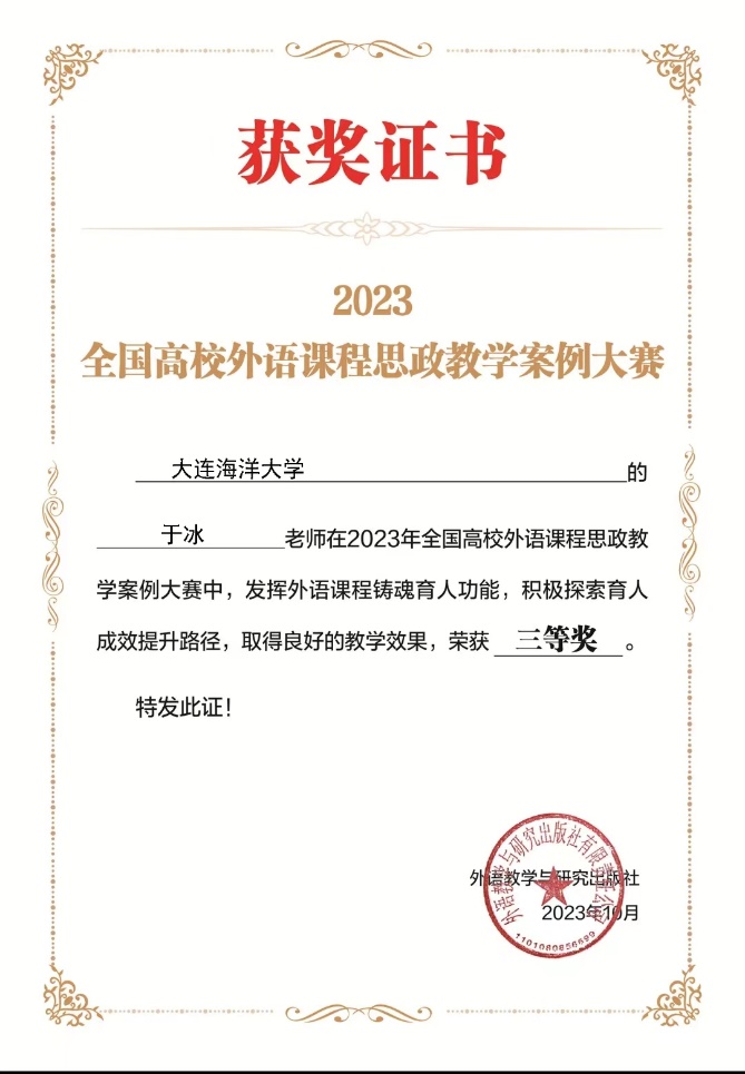 为全面推进高校外语课程思政高质量建设,落实立德树人根本任务,2023年8月,外语教学与研究出版社启动2023年全国高校外语课程思政教学案例大赛。麻豆视频 专业英语教研室教师崔永光和翻译专业教研室教师于冰申报的教学案例在大赛中分获二等奖和三等奖。
