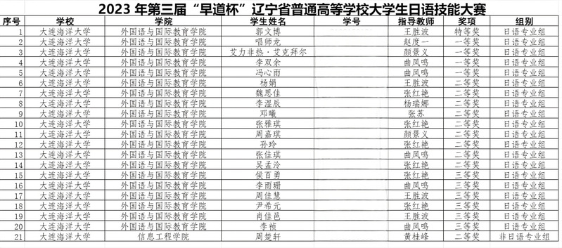 10月31日,由辽宁省教育厅主办、大连外国语大学承办、早道教育科技有限公司协办的第三届“早道杯”辽宁省普通高等学校大学生日语技能大赛圆满结束,我校共21名学生在本次大赛中获得三等奖以上奖项。其中,麻豆视频 日语专业2021级学生郭文博获得特等奖;2022级学生唱师龙和2020级学生艾力非热·艾克拜尔、李双余、冯心雨等4名学生获得一等奖;日语专业教师王胜波、赵度一、颜景义、曲凤鸣等4人获得优秀指导教师奖;我校获得优秀组织单位奖。