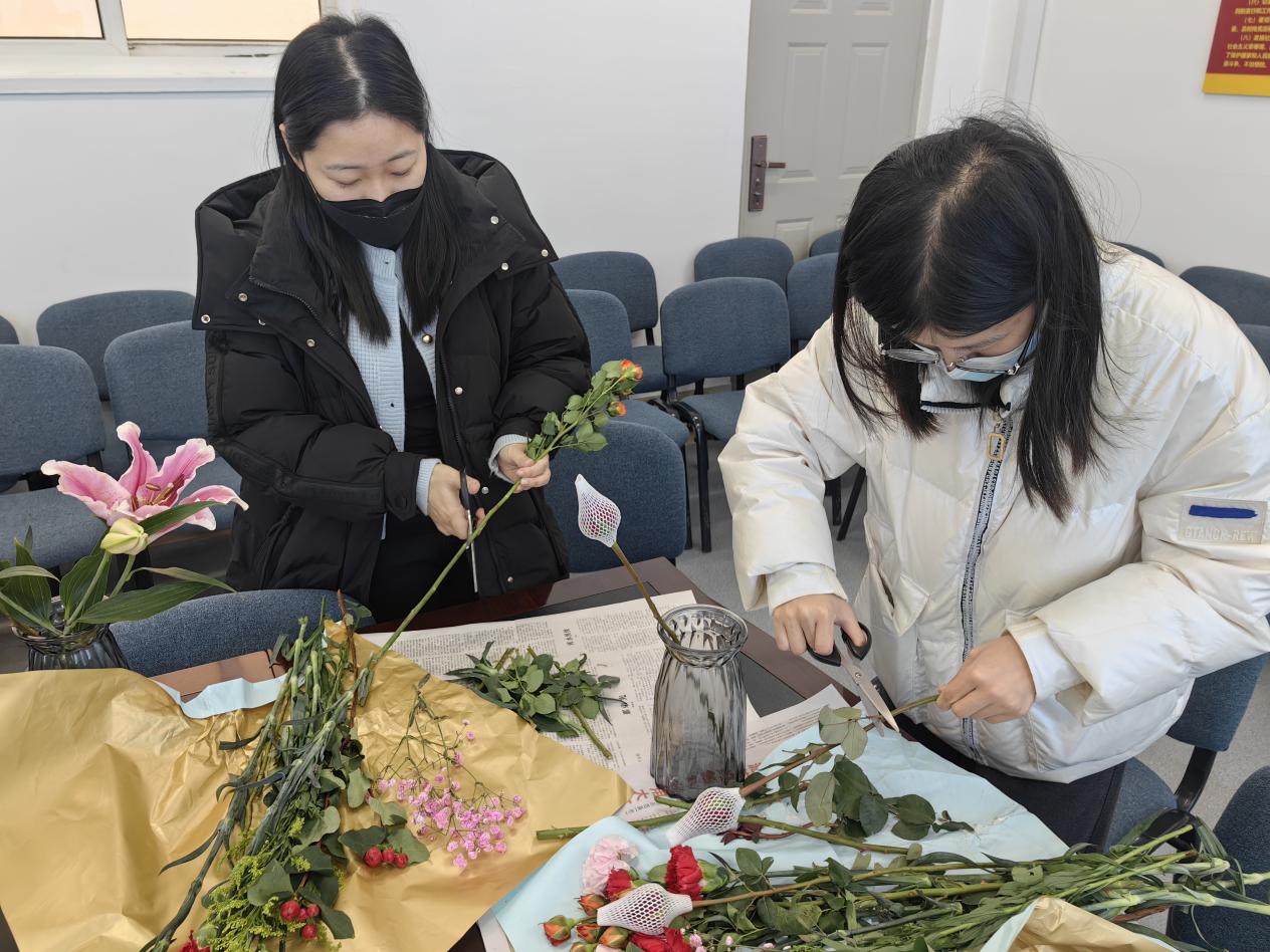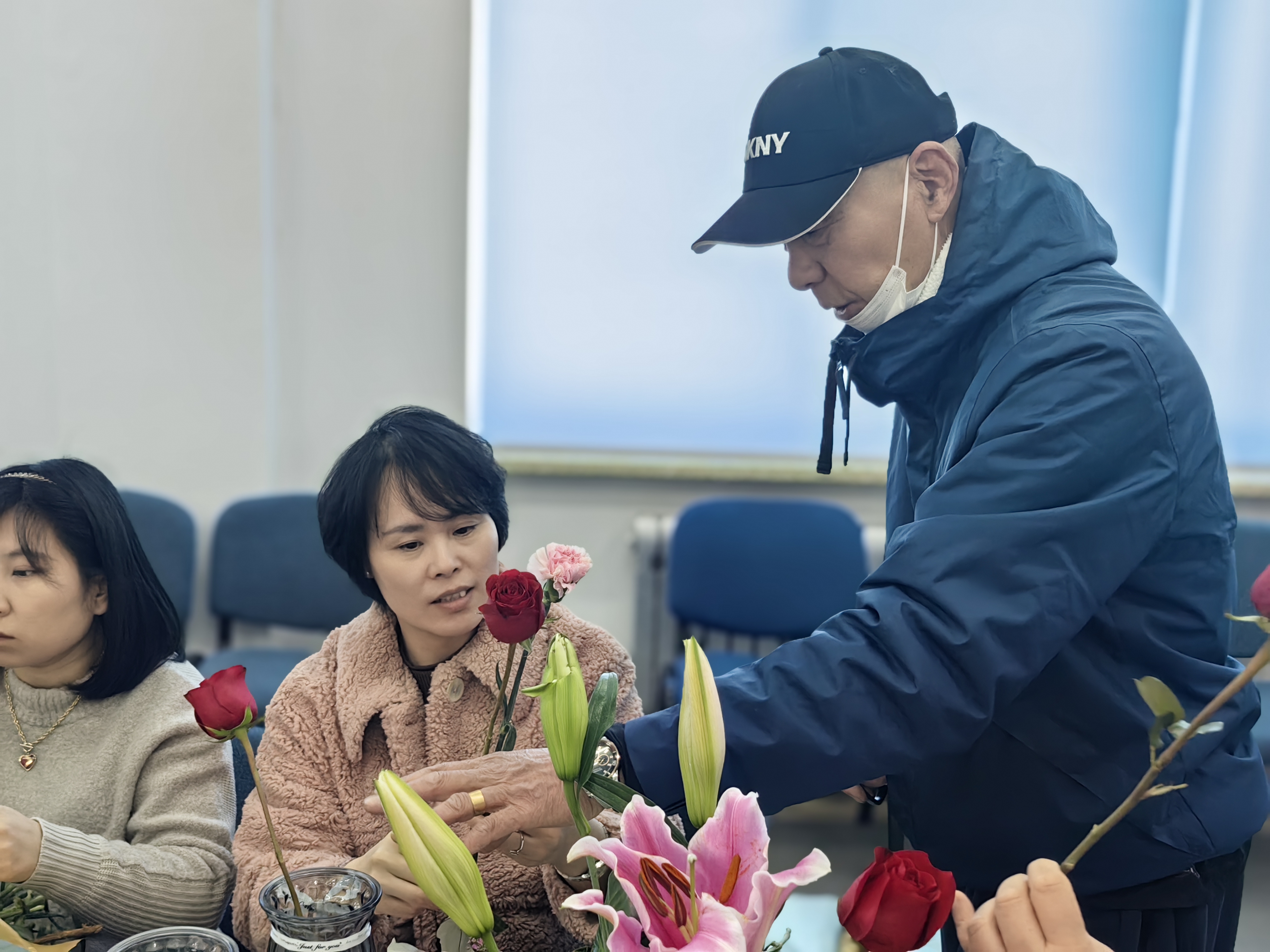 本次活动特别邀请了花艺专业老师现场进行插花艺术指导。花艺老师讲授了选花、养护、颜色搭配造型等艺术插花技巧。在他的指导下,大家开始投入作品创作,在一双双巧手下制作出了新颖别致的花艺作品。活动现场欢声笑语、气氛活跃,大家置身花海,满满的幸福感与成就感。