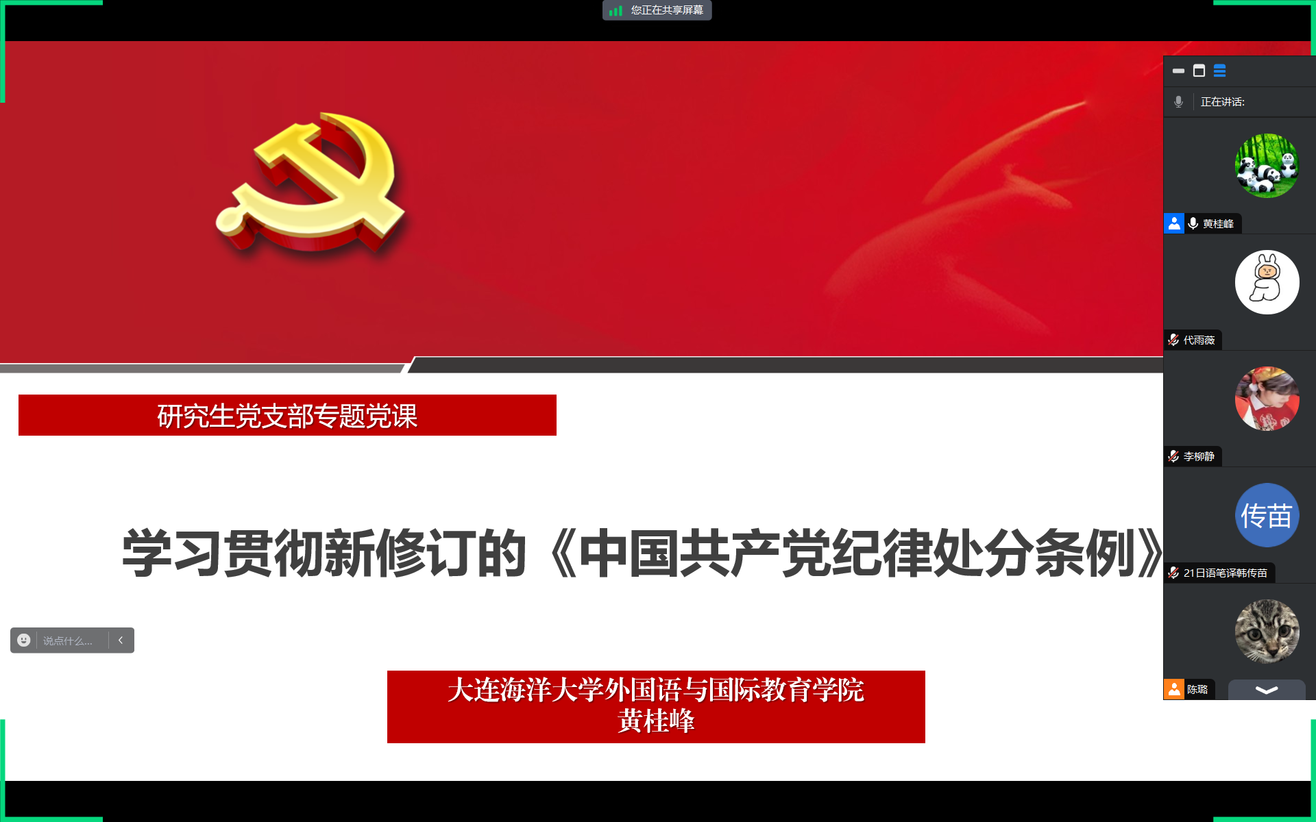 3月6日,麻豆视频 研究生党支部以线上线下结合的方式开展了3月党日活动。支部全体党员参加活动,其中研一在校生党员在学院党员活动室现场参加、研二和研三未返校党员以线上腾讯会议的方式参加了活动,活动由支部书记黄桂峰主持。