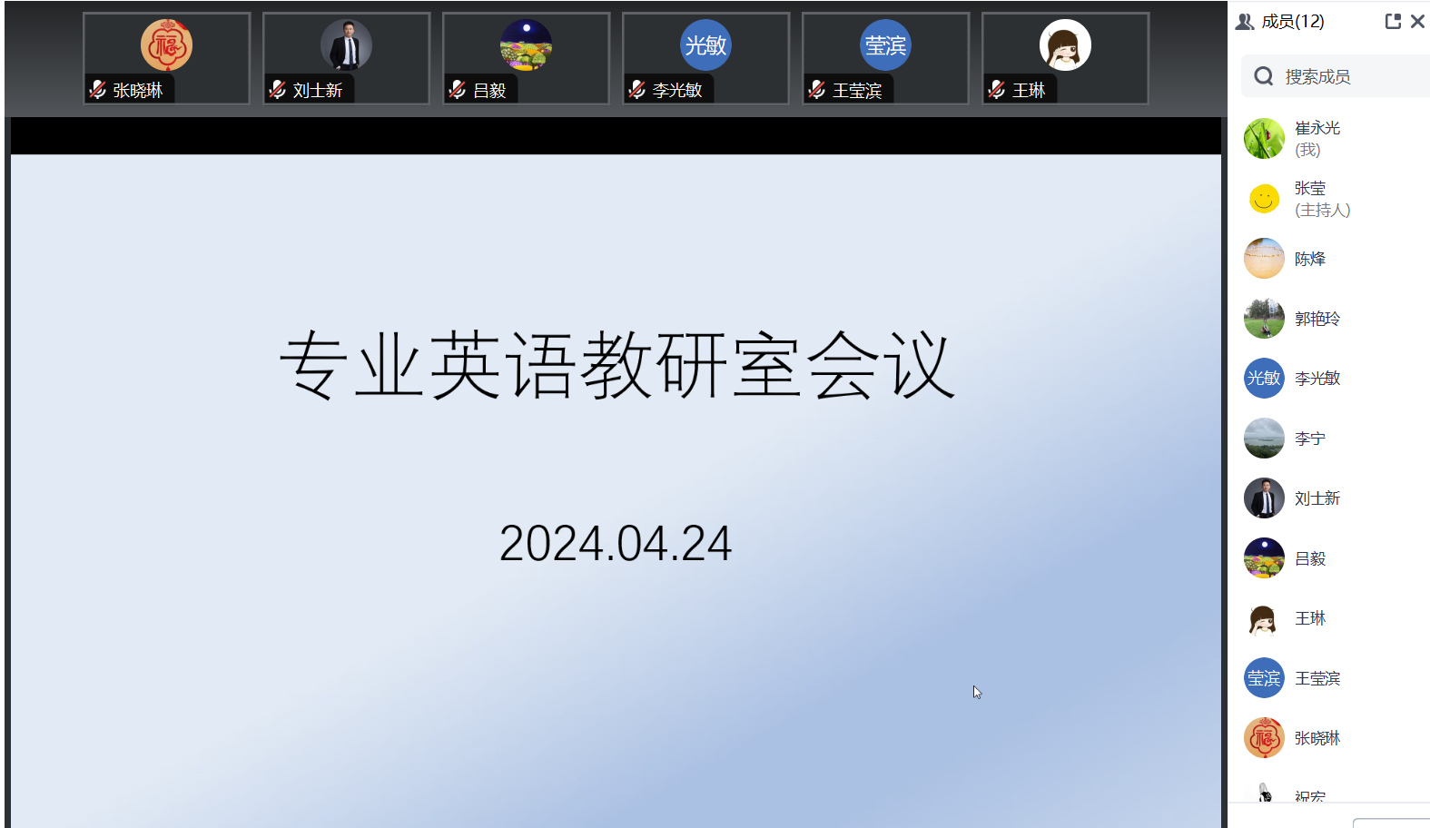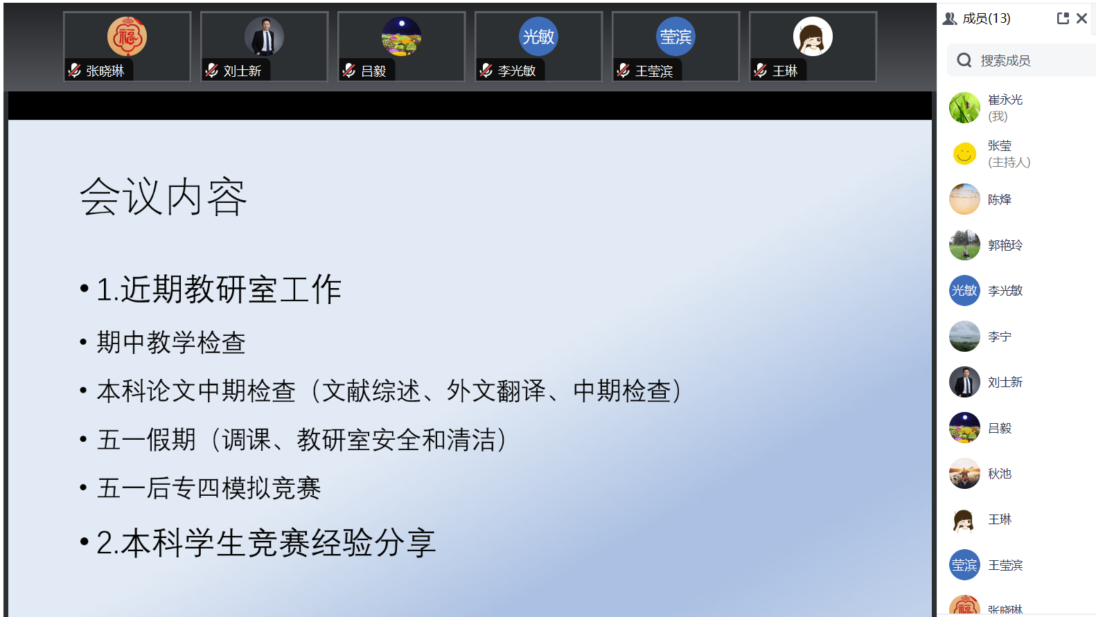 专业英语教研室组织全体教师开展了线上集体教研活动,重点讨论近期工作和本科生竞赛指导工作。会议由教研室主任张莹主持。
