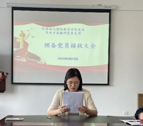 6月12日,专业日语教研室党支部在黑石礁校区学院会议室召开预备党员接收大会,讨论接收赵志丽同志为预备党员的事宜。会议由党支部书记颜景义主持。