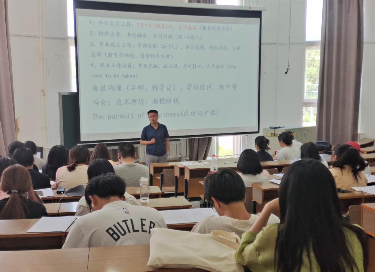 崔永光从第七学期毕业实习工作、人才培养方案课程设置、毕业论文工作和就业工作四个方面进行了讲解与动员。他要求全体学生要充分利用暑假积极开展毕业实习工作,同时结合自身情况设定考研目标;与导师积极沟通确定论文选题,掌握论文写作与研究方法,论文选题要紧密联系英语专业;同时要了解第七学期开设的相关实习实践与专创融合课程,按时返校上课;在校外实践中积累经验,积极参加校园招聘,推动高质量就业。