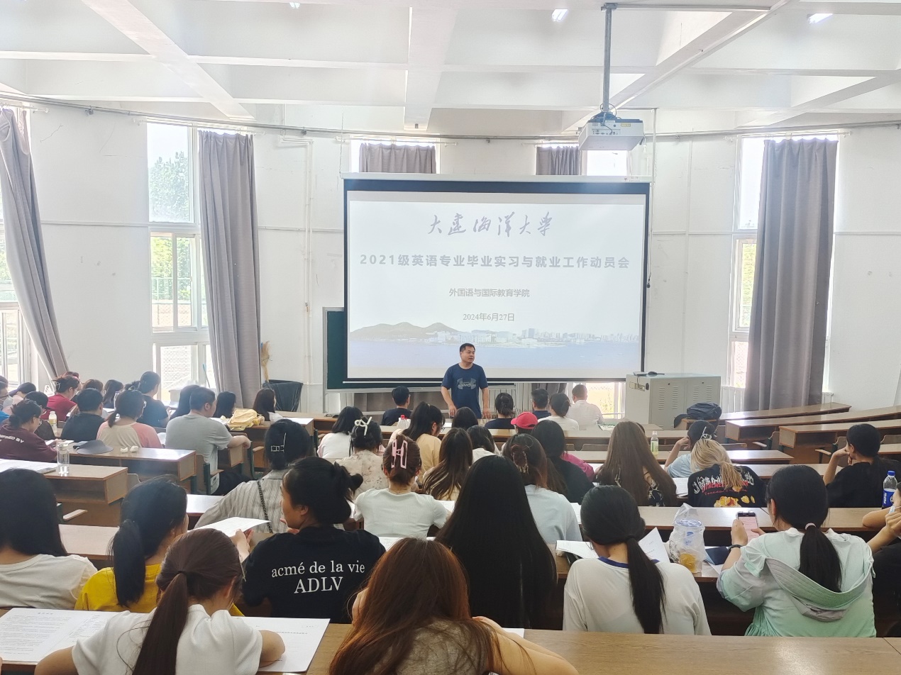 6月27日下午,麻豆视频 在大黑石校区召开2021级英语专业毕业实习和就业工作动员会。学院副书记付常兵、副院长崔永光、团委书记周宇颂和专业英语教研室副主任苍巍巍以及2021级英语专业全体学生参加会议。