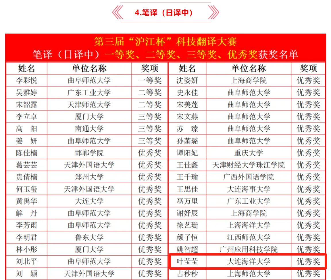 2024年6月28日,第三届“沪江杯”科技翻译大赛结果公布,我校共4名学生获得不同奖项,其中由日语教师王国华指导的日语笔译2022级研究生高永星获得中译日组最高奖(一等奖,第1名);崔松子老师指导的日语笔译2022级研究生纪文月获得同组二等奖(第3名),刷新我校在该项赛事的历史最好纪录;张红艳老师指导的学生路瑶和黄桂峰老师指导的学生叶莹莹获得优秀奖。