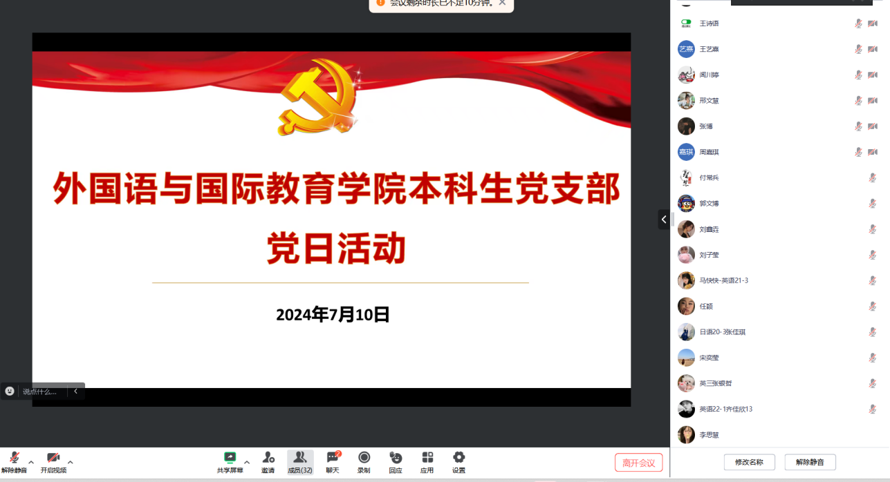 本科生党支部线上开展了7月党日活动。支部全体党员参加会议,会议由支部书记戴鑫主持。