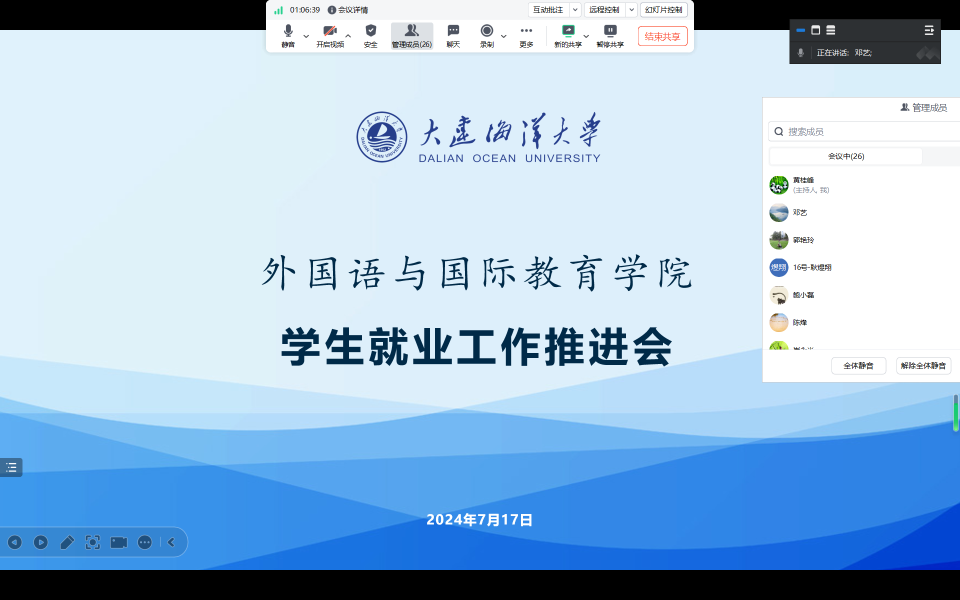 为落实学校2024届毕业生就业会议精神,推进学院就业工作走深走实,7月17日晚上,麻豆视频 通过腾讯会议召开学生就业工作推进会,学院党委书记邓艺、院长郭艳玲、副院长崔永光、副书记付常兵、纪委书记黄桂峰、辅导员及本科生和研究生论文指导教师参加会议。会议由黄桂峰主持。