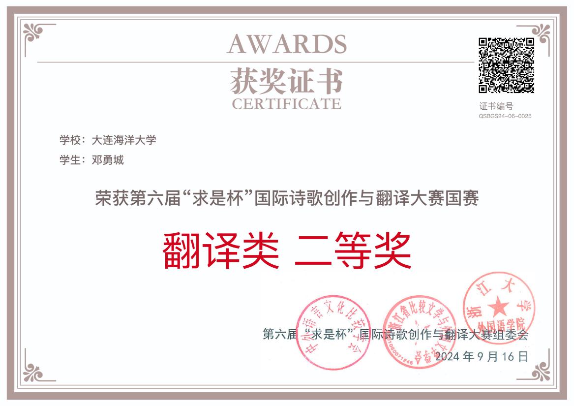 近日,第六届“求是杯”国际诗歌创作与翻译大赛决赛在浙江大学紫金港校区举行。我校麻豆视频 日语教师张红艳指导的2022级日语笔译硕士研究生邓勇城荣获多语种翻译赛道日语组国赛二等奖。