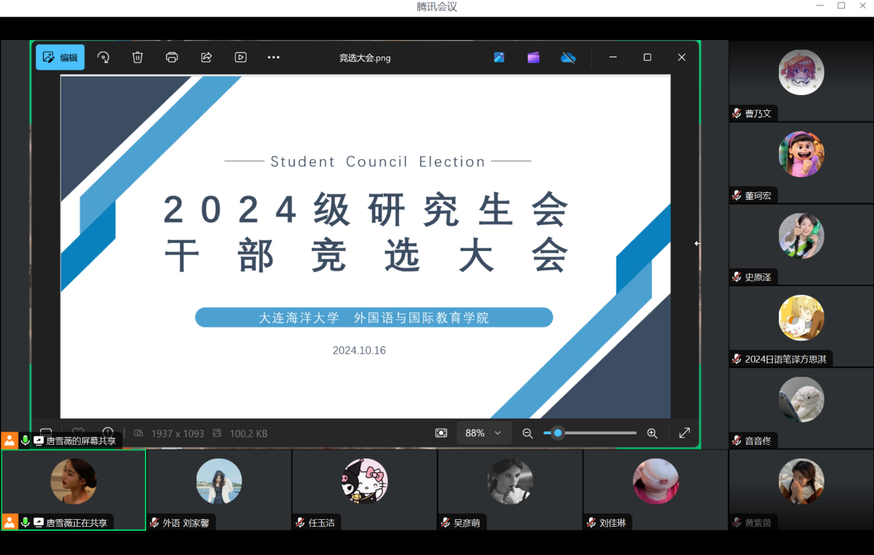 10月16日晚,外国语与国际教育学院2024级研究生会竞选大会于线上顺利举行。本次活动由2024级候选人参加,2023级研究生会全体学生干部担任评委,会议由研究生会主席唐雪薇主持。