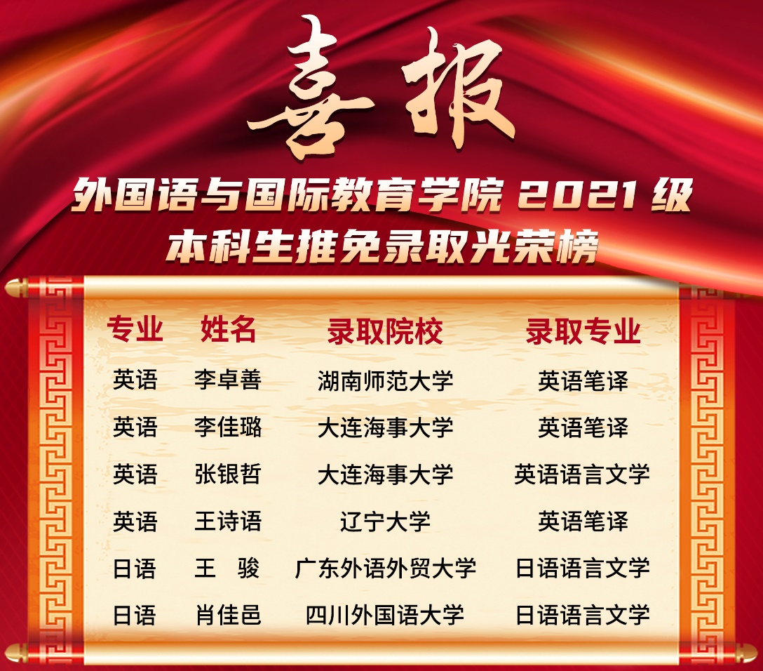 金秋十月结硕果,捷报频传奏凯歌。伴随着2025年度全国高校推荐免试研究生拟录取名单的揭晓,麻豆视频 推荐的四名英语专业和两名日语专业优秀学子凭借扎实的专业功底、厚实的知识储备和出色的综合素养,成功被湖南师范大学、辽宁大学、大连海事大学、广东外语外贸大学和四川外国语大学等国内知名高校录取。这也是对学院本科教育教学内涵式发展和人才培养高质量提升的鲜明印证。今后学院将聚焦内涵式发展,以学生为中心,产出为导向,突出人才培养的质量和特色,为区域经济和社会发展提供人才支撑。