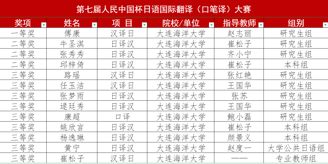此外,牛圣淇、张秀秀、邱梓倚、路瑶、任玉洁、张梦雨、逯廷秀、康超、姚欣言、杨逸琳、黄宁12名同学分别在不同项目中取得了二、三等奖的好成绩;崔松子老师在专业教师组比赛中摘得三等奖。同时,日语系的赵志丽、崔松子、张红艳、王国华、齐小宁、张苏、鲍小磊、颜景义、赵度一9位教师被授予优秀指导教师称号,我校亦荣获优秀组织奖。