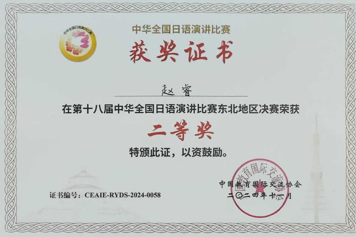 东北三省共28所高校的优秀选手参加了本次比赛。赵睿同学以其扎实的日语功底、丰富的知识储备、严密的思辨能力和沉稳的现场表现,给评委和观众留下了深刻印象,最终荣获二等奖,充分展现了我校日语学子的风采。