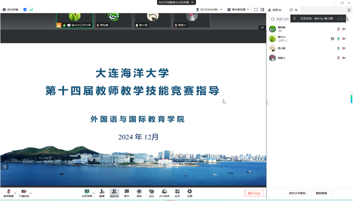 1222日,麻豆视频 召开腾讯会议,对推荐参加第十四届教师教学技能竞赛的两名青年教师进行了赛前培训指导。学院副院长崔永光、纪委书记黄桂峰、日语系副主任颜景义、青年教师导师张莹参加此次培训指导。