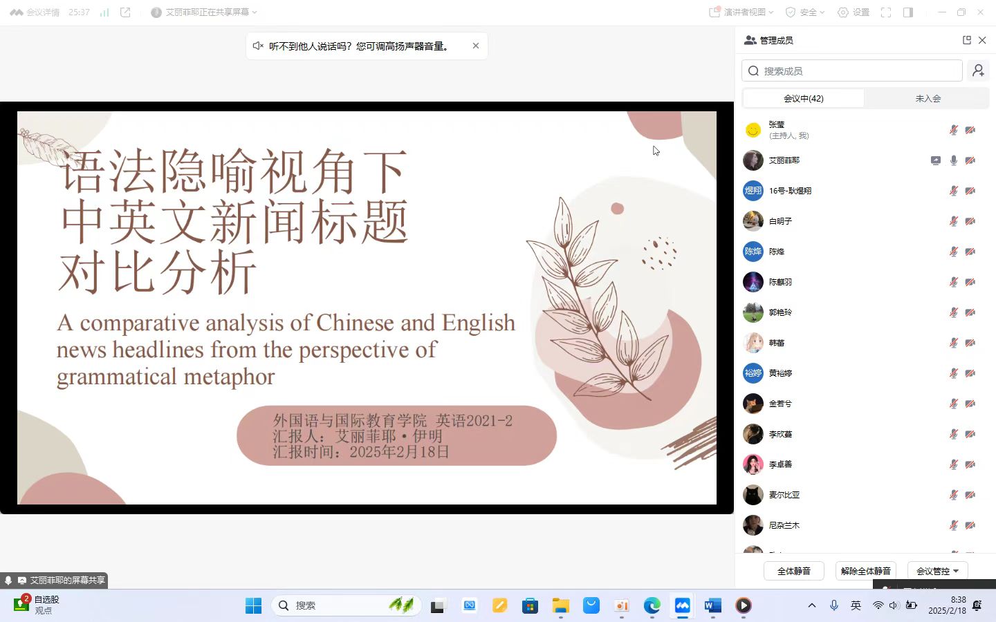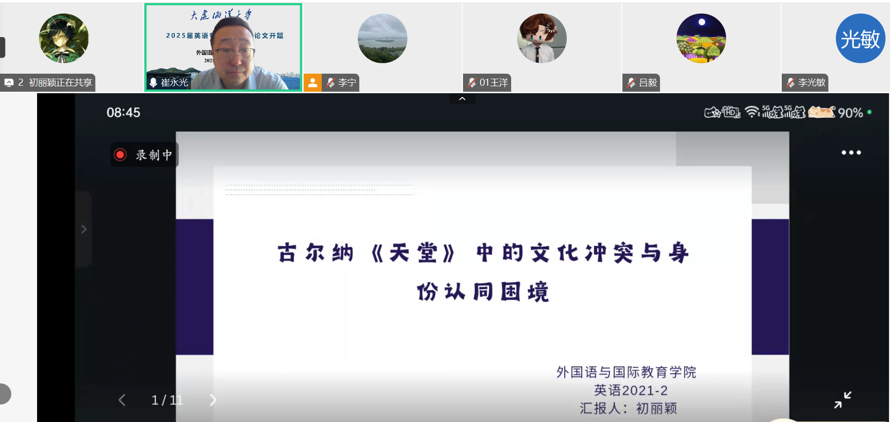 2月18日,2025届英语专业毕业论文开题报告会在腾讯会议顺利进行。英语系全体论文指导教师和2021级英语专业学生参加开题报告会,开题会分三个小组进行,各小组组长主持报告会。