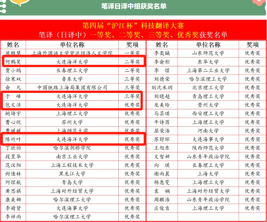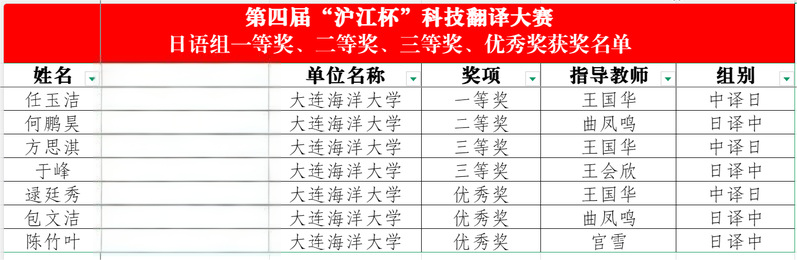 6月18日,第四届“沪江杯”科技翻译大赛结果揭晓。本次大赛有来自全球242家院校及企事业单位,共计2192人次报名参赛。我校共7名学生获得不同奖项,其中由日语教师王国华指导的日语笔译2024级研究生任玉洁获得中译日组最高奖(一等奖,第1名),再度夺冠,创造连续两年蝉联该组最高奖项的佳绩;曲凤鸣老师指导的日语笔译2024级研究生何鹏浩获得日译中组二等奖(第2名),再度刷新我校在该项赛事的历史最好纪录。此外,王会欣老师指导的学生于峰、王国华老师指导的学生方思淇也分别获得不同组别的三等奖。