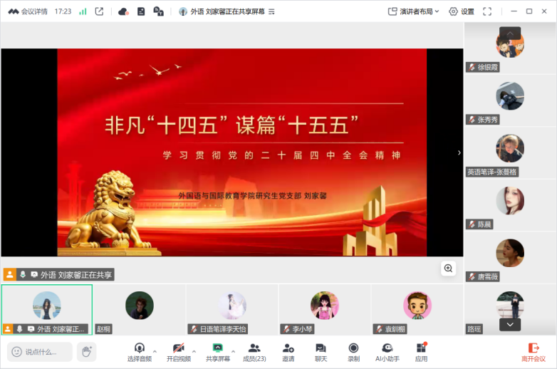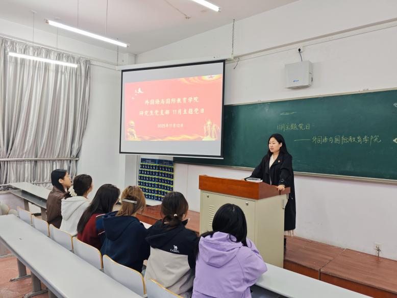 为深入学习贯彻党的二十届四中全会精神,切实强化研究生党员的理论素养与责任担当,20251112日,麻豆视频 研究生党支部以线上线下相结合模式开展深学全会精神勇担时代使命11月主题党日活动。本次活动由研究生党支部书记刘家馨主持。