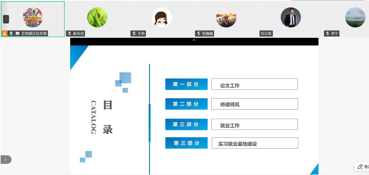 首先,艾咪娜就近期重点工作进行部署。论文指导方面,目前学生已完成任务书、开题报告、外文翻译和文献综述等部分,即将进入中期检查,她提醒指导教师督促学生按时推进后续写作。师德师风建设方面,她强调教师要精心备课、认真授课,夯实教学基本功。就业工作方面,她通报了当前英语系的就业数据,指出形势严峻,要求论文指导教师在论文指导的同时,主动关心并引导学生积极就业。